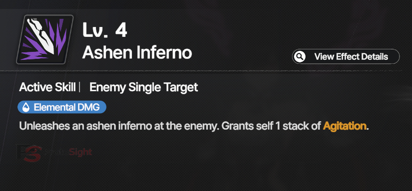 Her basic attack grants 1 Agitation stack, which itself grants 1% bonus damage to Order units (up to 5 stacks). Additionally, gains a chance to gain Inferno stacks at 20% chance per stack of Agitation.