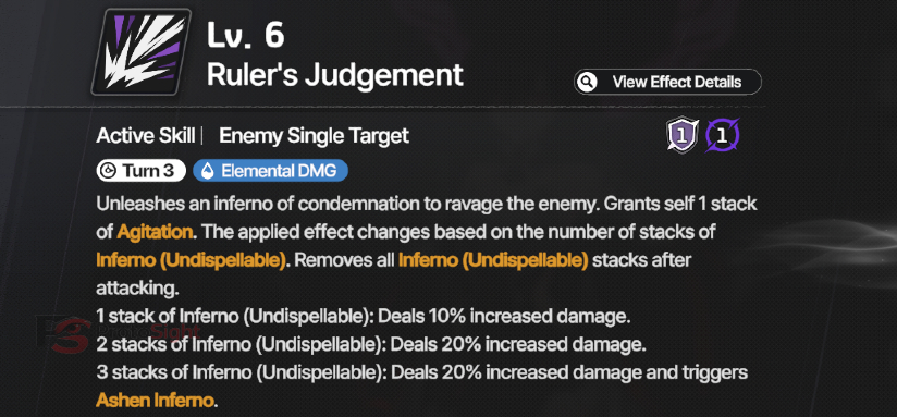 3 Stacks: 20% Bonus DMG + triggers Ashen Inferno (basic attack)