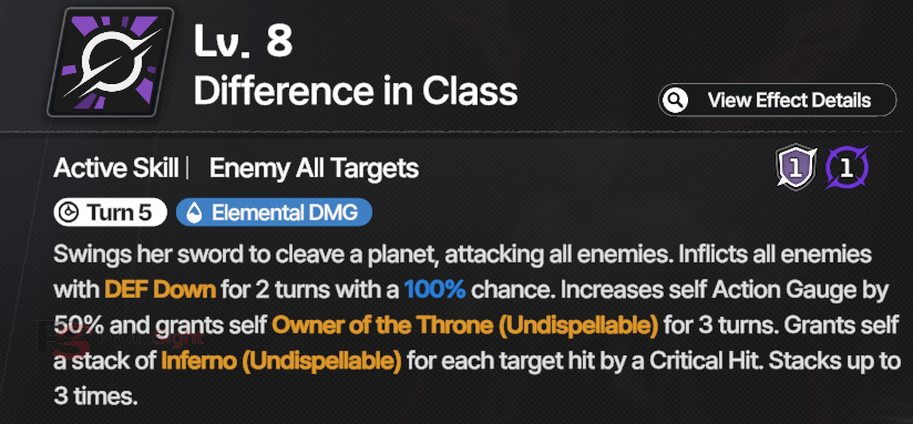 This is Rosaria’s AOE Damage. She attacks all enemies and inflicts DEF Down with a 75% chance (up to 100%) and increases her Action Gauge by 50% (!!!). She also gains a new buff, Owner of the Throne (undispellable) for 3 turns, granting increased Basic Skill DMG and SPD by 15%. Additionally, for every enemy hit by her ultimate, she also gains a stack of Inferno.