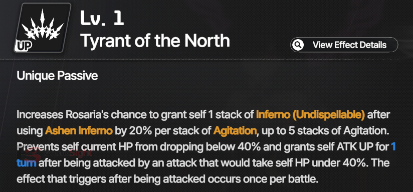 After using her basic attack, Rosaria gains a chance to generate a stack of Inferno (undispellable) based on Agitation stacks (up to 100% at 5 stacks). She also prevents her HP from dropping below 40% once per battle, granting additional ATK Up when triggered.